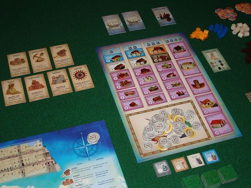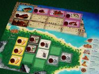 ● Imbalanced buildings. The two-player game is not perfectly balanced as it is in 3-5 player games, because certain buildings become less useful than in a multi-player game (e.g. Construction Hut), while others become more useful than in a multi-player game (e.g. Office). More useful: With less players, the Trading House becomes hard to empty, so as a result the Office can be very important. Only having two ships available for shipping also keeps things tense, and this subsequently can make the Wharf a very strong building to have. Less useful: Given the limited number of quarries in play, the Construction Hut is less useful than normal, and often goes unbuilt. I wouldn't favour increasing the amount of quarries to fix this, because competition for the five quarries can be important, so limiting them to just five is a good move - if there is going to be a `patch' for this weakness, rather than using all eight quarries to `rescue' the Construction Hut, I'd rather be inclined to use some of the expansion buildings in place of it. Because of this imbalance the official two-player variant does feel slightly flawed, although it's not something that breaks the game by any means, and there are are simple `patches' that have been suggested to fix some of these imbalances (e.g. have two Office tiles in play).