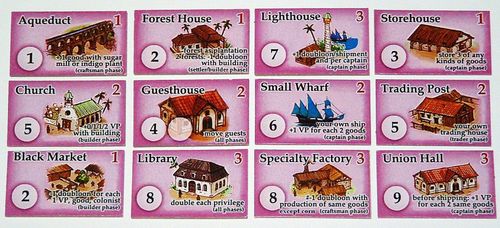 ● Drafting: Players draft buildings one at a time, respecting the costs noted on the board (i.e. only one purple building costing 1 doubloon, two costing 2, one costing 3, etc.) Note that selecting certain buildings will automatically eliminate others, given the requirement to respect the costs on the board. Draft-as-you-go: A variant of this method is to keep all buildings in play, and eliminate excess buildings of a certain value/cost as soon as two have been purchased. As explained by one gamer who uses this method: "We put all the buildings (original + expansion) alongside the board and they get drafted as players build them. We still respect the number of buildings available at each price (as stated above: one 1-cost building, two 2-cost buildings, etc.). So, for example, once the first two 2-cost buildings have been chosen, the other 2-cost buildings are no longer available in the game. "
