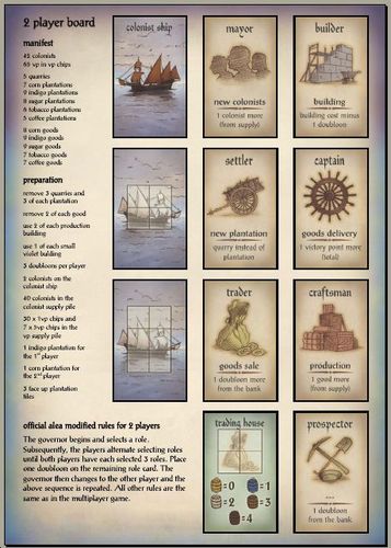 In the Alea variant, the following changes are made to the original rules of the multi-player game: ● Player setup: Each player begins with 3 doubloons, 1 Indigo (player #1 = Governor) or 1 Corn (player #2) ● Remove: 3 plantations of each type, 3 quarries, 1 of each small violet building, 1 prospector role tile, 2 of each good ● Use: 3 face up plantations, 5 quarries, 2 of each production building and 1 of each violet building, 6 remaining role tiles ● Use: 65 VPs, 40 colonists plus 2 on the ship, 4 and 6 capacity cargo ships ● Gameplay: Players alternate selecting a role as usual, until both have selected 3 roles. One doubloon goes on the remaining role card and then the other player becomes Governor.