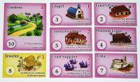 Random buildings: Instead of using one of each of the 12 buildings, another possibility is to draw 12 random buildings from a pool of 24 (2 of each), which means you may have 2 of some buildings, 1 of others, and 0 of others. This also changes the game each time, and prevents players from following a set strategy, but it also limits their choices to some extent. Note that randomizing buildings from the expansion will be covered later in this review.