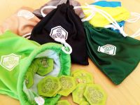 A set of seven drawstring bags to store and draw tiles from in Castles of Burgundy. These are sublimation printed microfiber bags measuring 10 cm deep by 9 cm wide.