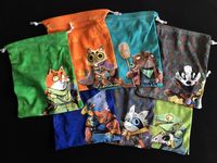 A set of seven drawstring bags to store each clan from Root. These are sublimation printed microfiber bags, with the smaller bags measuring 16 cm deep by 13 cm wide.